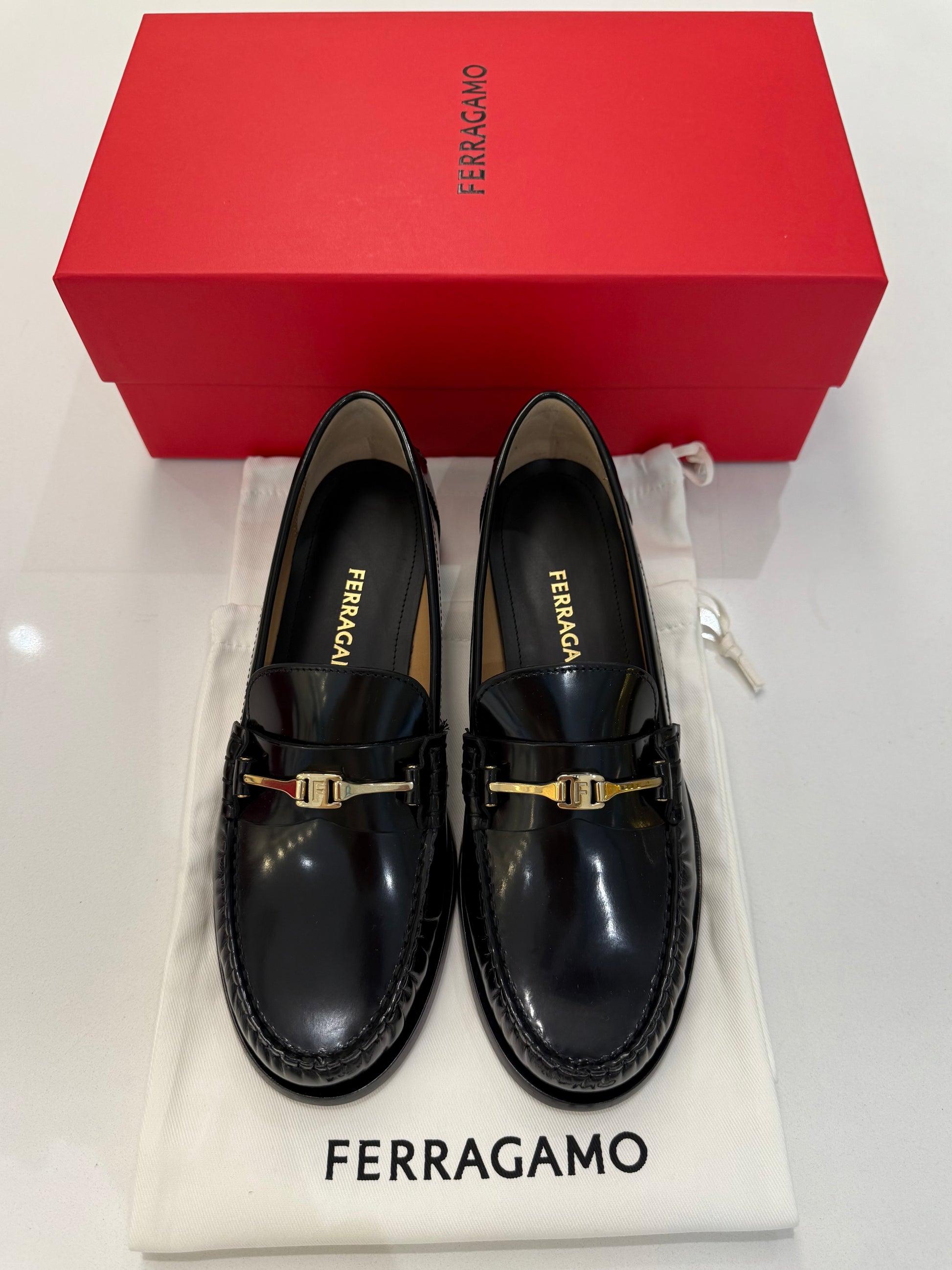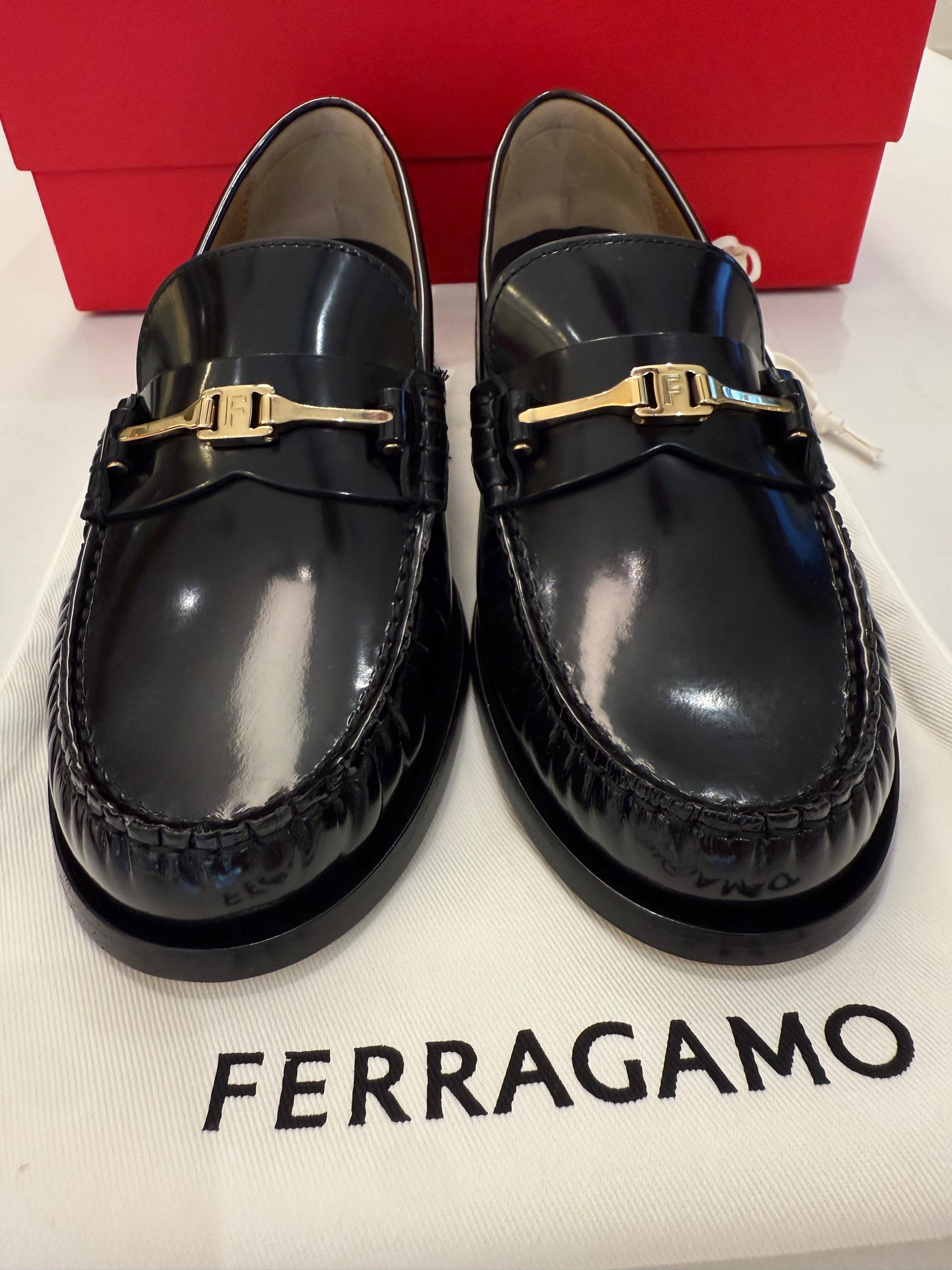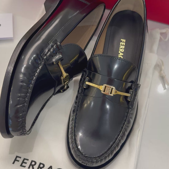 Ferragamo Women's Harry Calfskin Bit F Buckle Loafers Nero Biscotto 7C
